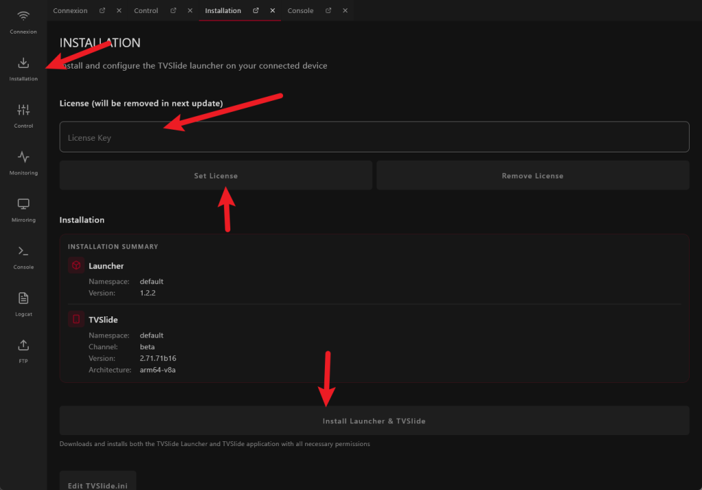 Une fois connecté, allez dans l’onglet « installation », puis renseignez la licence, et cliquez sur « set license », puis « install launcher & TVSlide ».