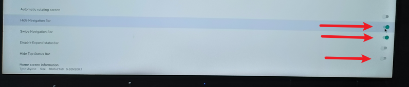 Retournez ensuite dans le menu principal, puis dans les paramètres écran. Activez les coches suivantes (Hide navigation bar / swipe navigation bar et Hide Top status bar)