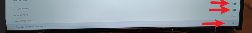 Vérifiez que les cases « open uart 0 debug » et « Power on startup » soient activées et que « show power button on navigation bar » soit désactivée, comme ci-dessous :